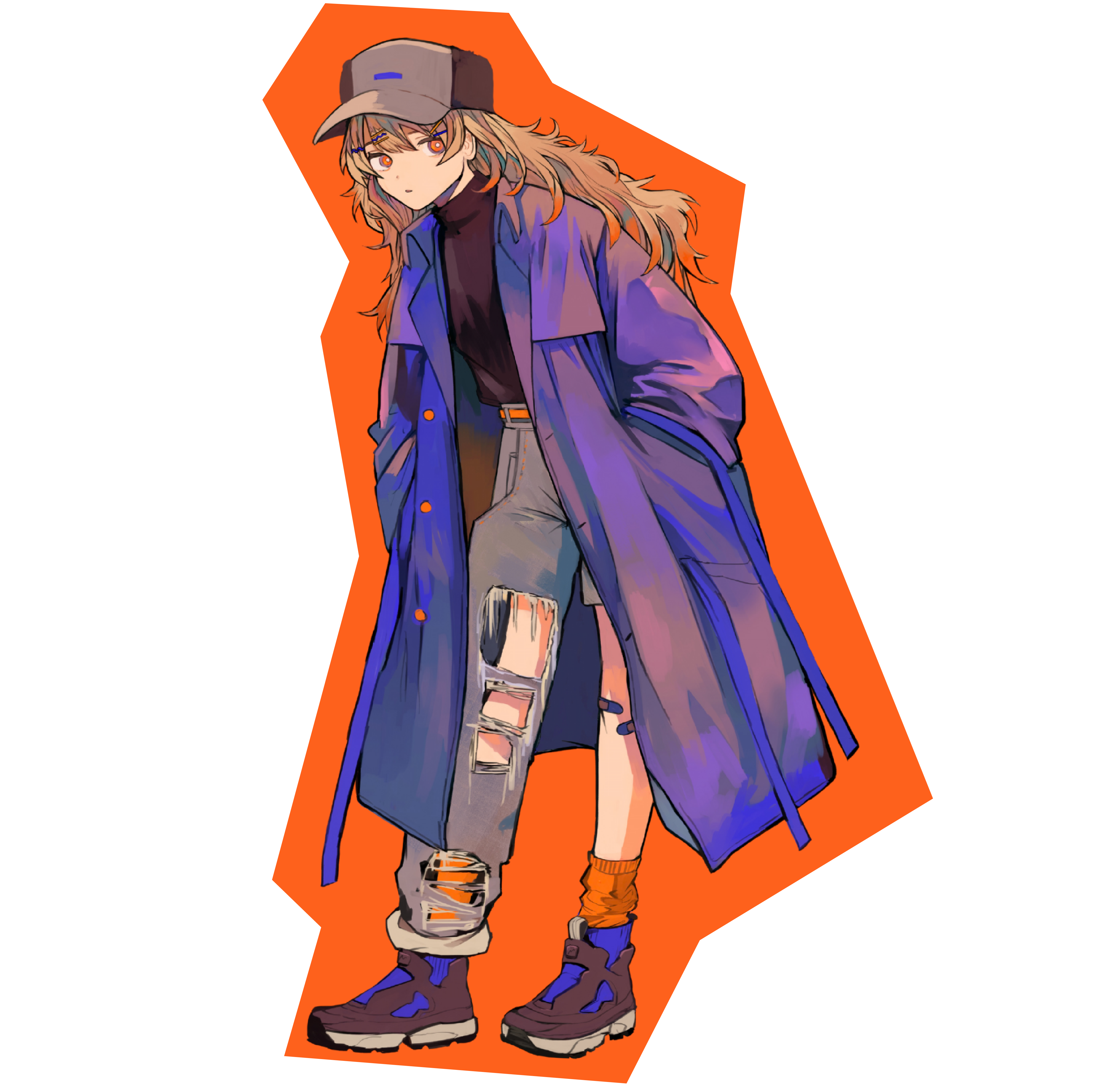 キャップにオーバーサイズのロングコート、ダメージデニムというこだわりのストリートファッションをクールに着こなす女の子のイラストをデザイン。キャラクターのシルエットに沿って切り抜かれたフォルムと、縁取りにあしらわれた鮮やかなオレンジが、目を引くポップなアクセントになっています。